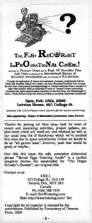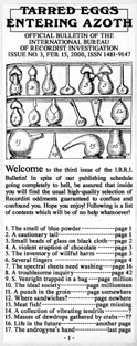 Tarred Eggs Entering Azoth (I.B.R.I. Bulletin #3) was published by Emunctory of Dreams Press on Feb. 15, 2000. It was edited and designed by W.A.Davison with contributions from Sam Andreyev, James Bailey, Joda Clement, S.Higgins, Donovan Morrison, Jim Munroe, Ryan Worrall, Steve Venright, Kerry Zentner, Monty Cantsin, Dan Jones, and W.A.Davison. It was printed as a double-sided b+w photocopy on 8.5" X 14" paper, folded to make an 8 page booklet. Less than 100 copies were printed. The images above give an idea of the layout and overall look of the bulletin. A web approximation of the bulletin, including the full text and original images, exists on this site and is accessible by clicking the links above. Please remember that some information such as web, e-mail, and postal addresses may be out of date.